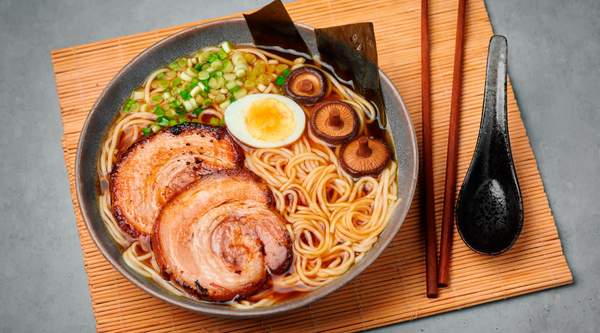 Base de molho de soja, noodles de trigo, cachaço de porco, espinafres, cogumelos, rebentos de soja, caldo de carne, meio ovo ajitama, alga nori e shichimi togarashi