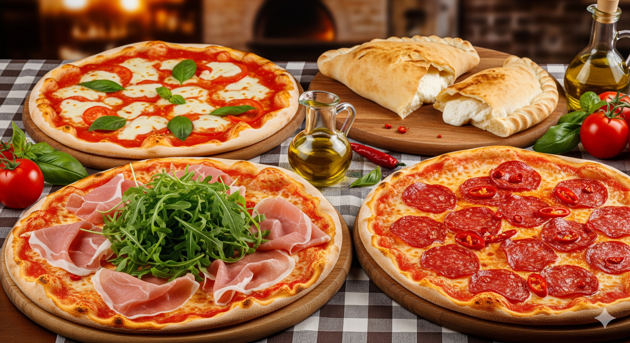 Com tomate, mozzarella, chouriço, fiambre, cogumelos, pimentos, cebola atum, azeitonas e ovo