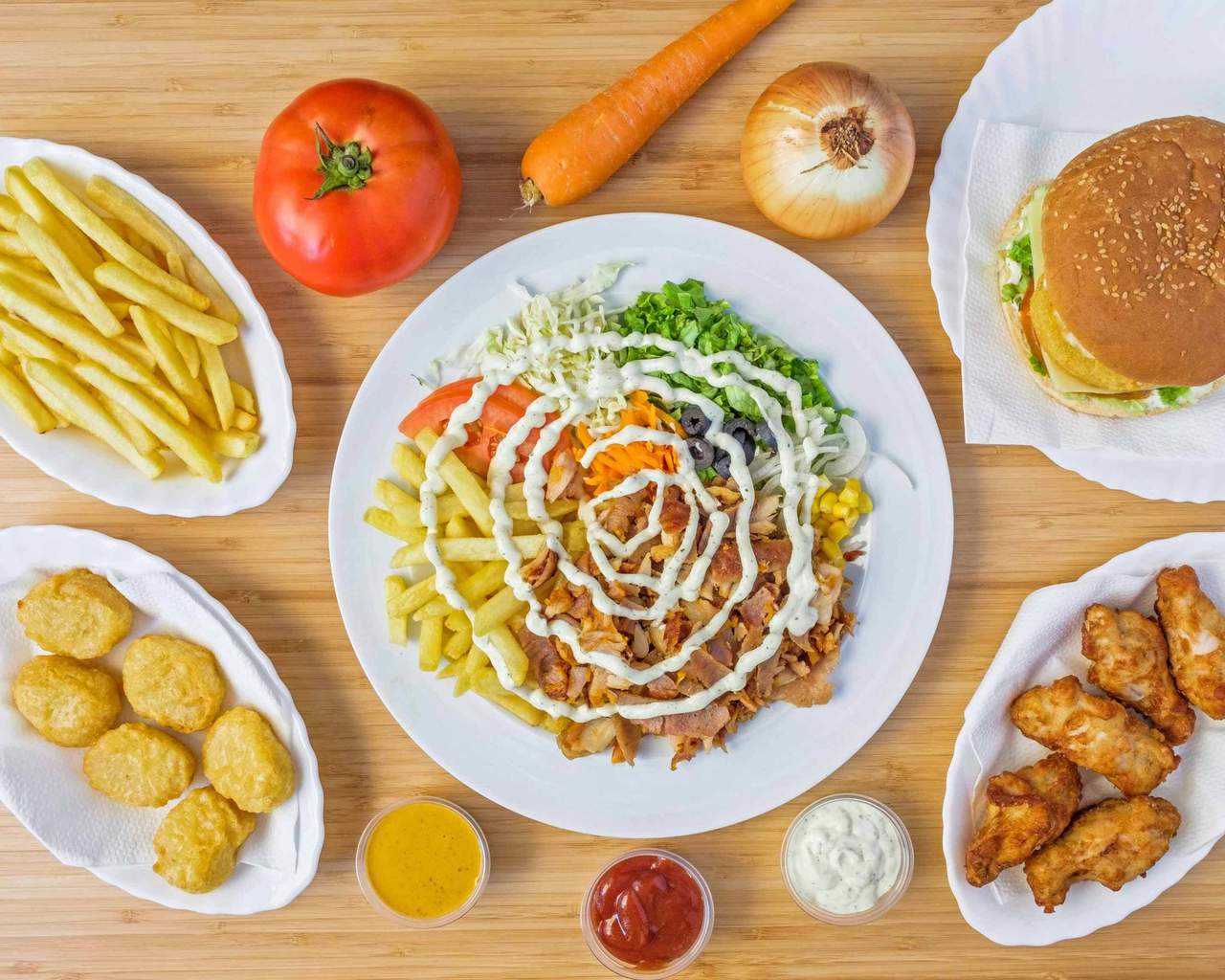 Kebab de carne com salada, molho e batatas
