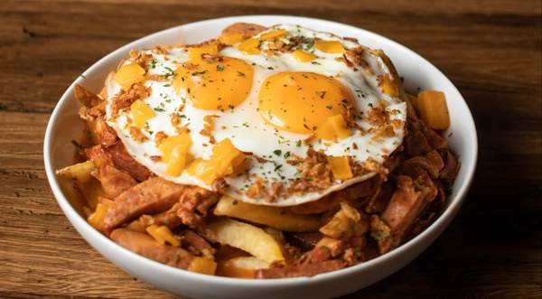 Batata-frita, cebolada de linguiça toscana, bacon, ovos e queijo