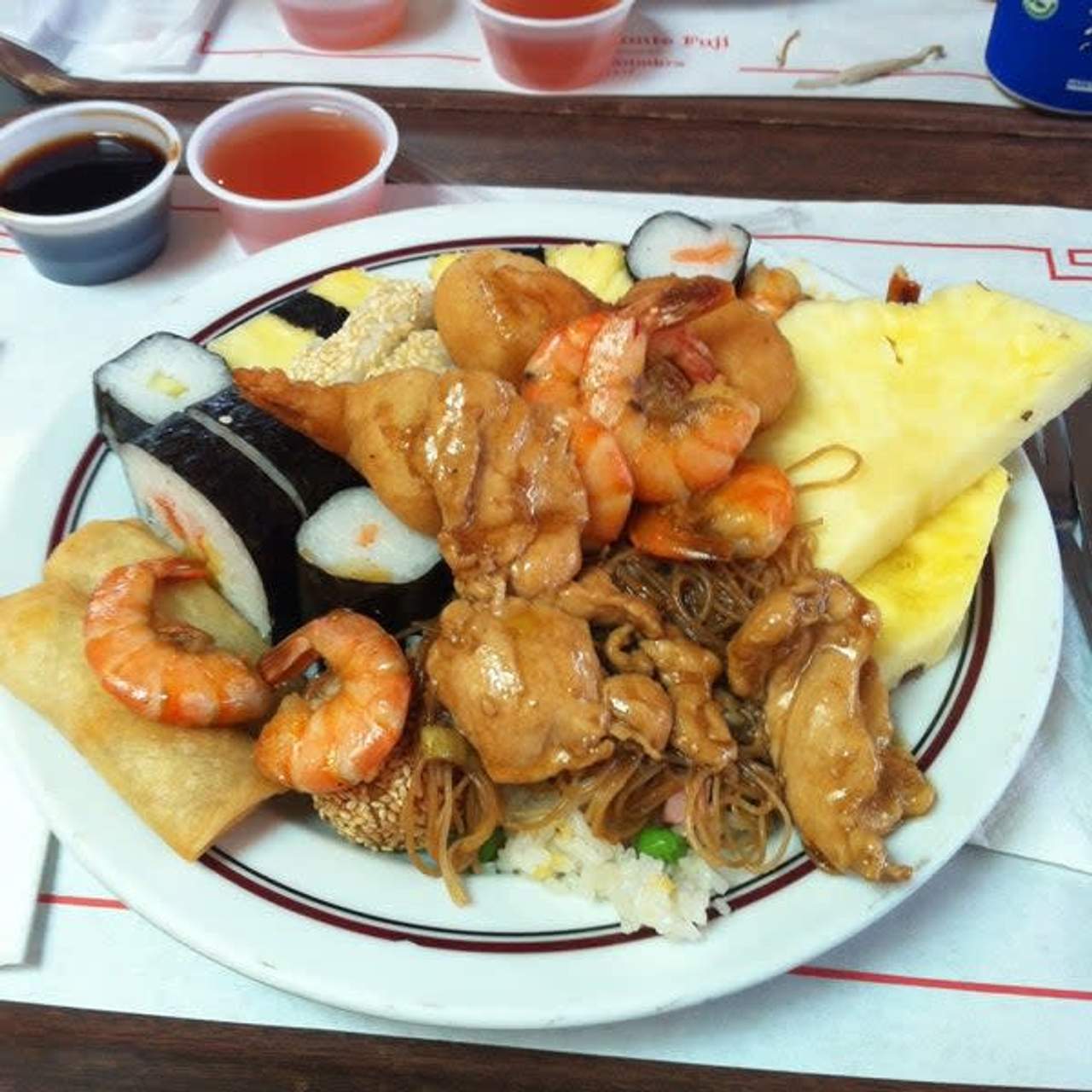 3 pratos fritos, 2 pratos salteados e 10 peças de sushi.