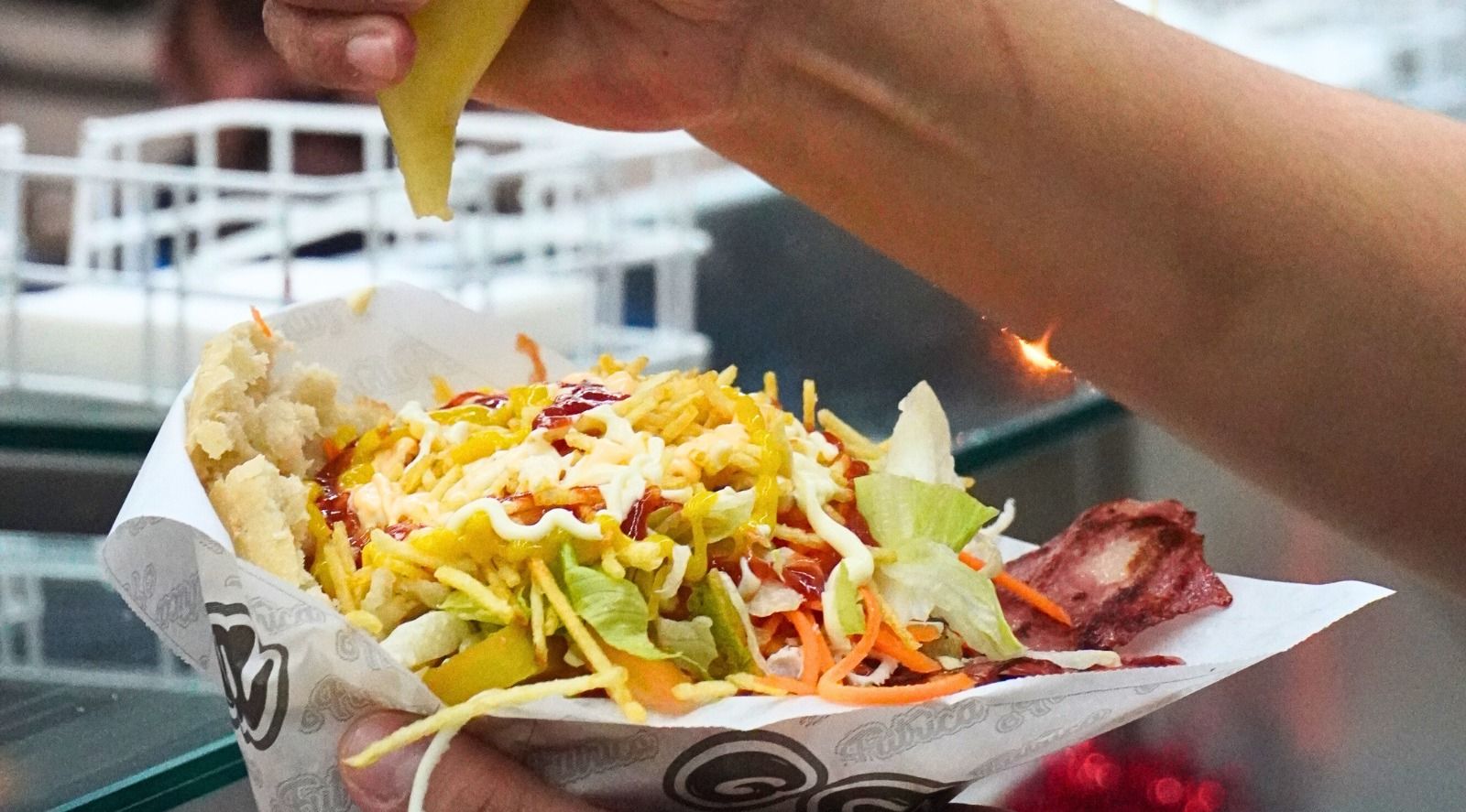 Box com batata palito frita na hora e kebab. Molhos e ingredientes à escolha.