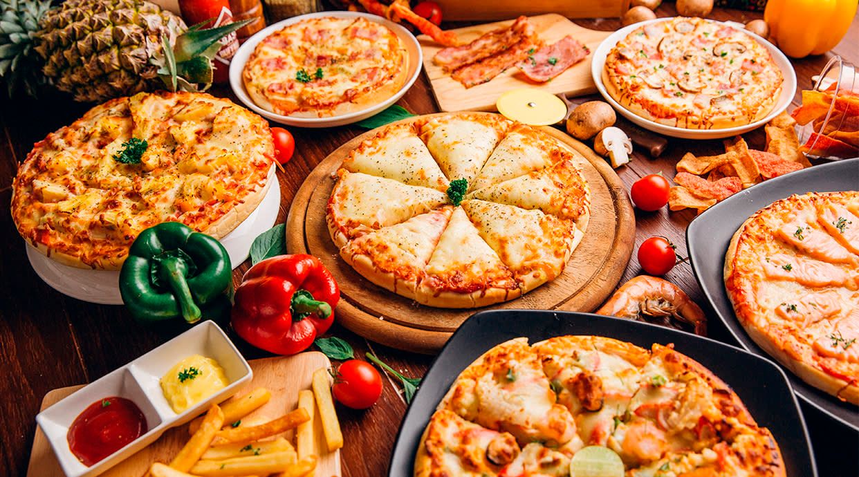 Tomate, mozzarella, fiambre, milho, tomate fresco, peperoni e palmito.