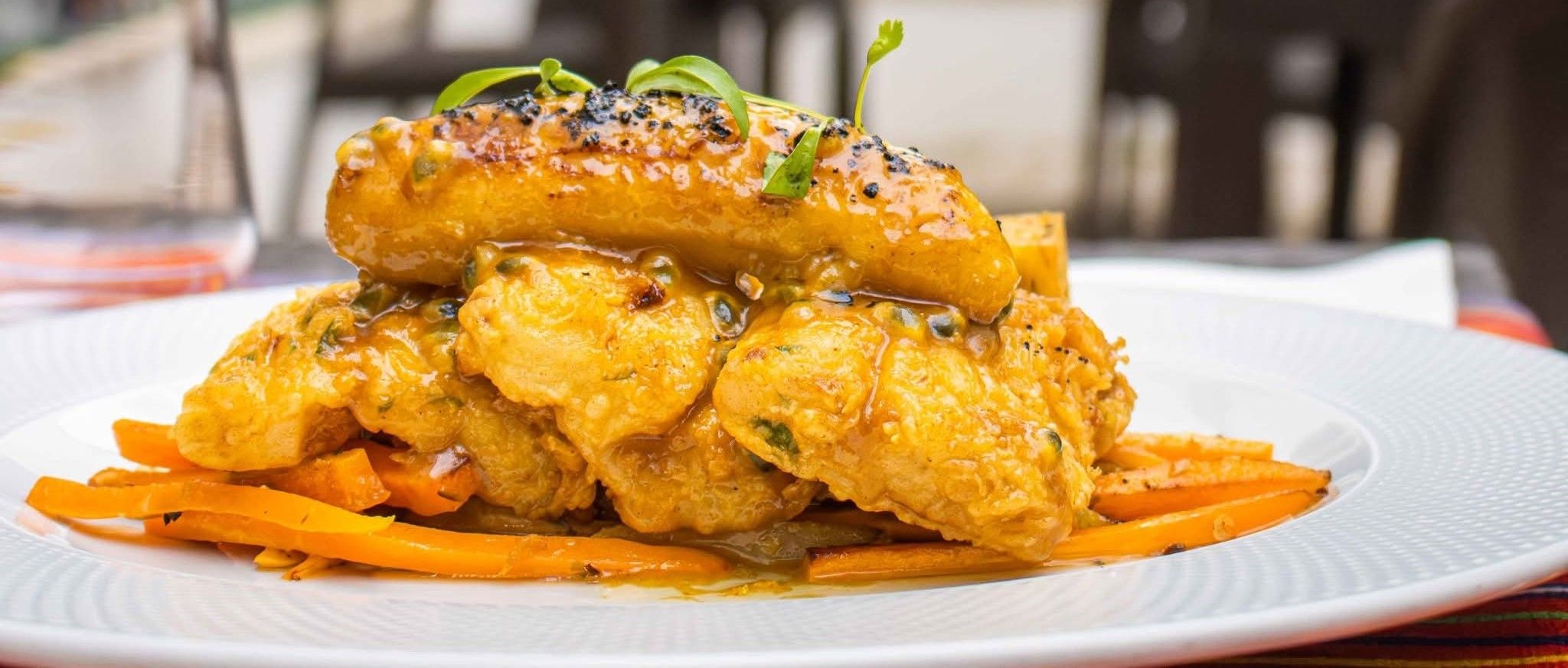 Com banana frita, molho pimpinela, cenoura e milho frito