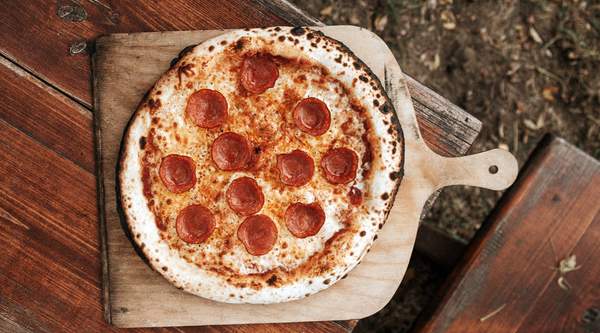 Molho de tomate, mozzarella, queijo fumado, cogumelos, azeitonas pretas e bacon. Contém leite e glúten.