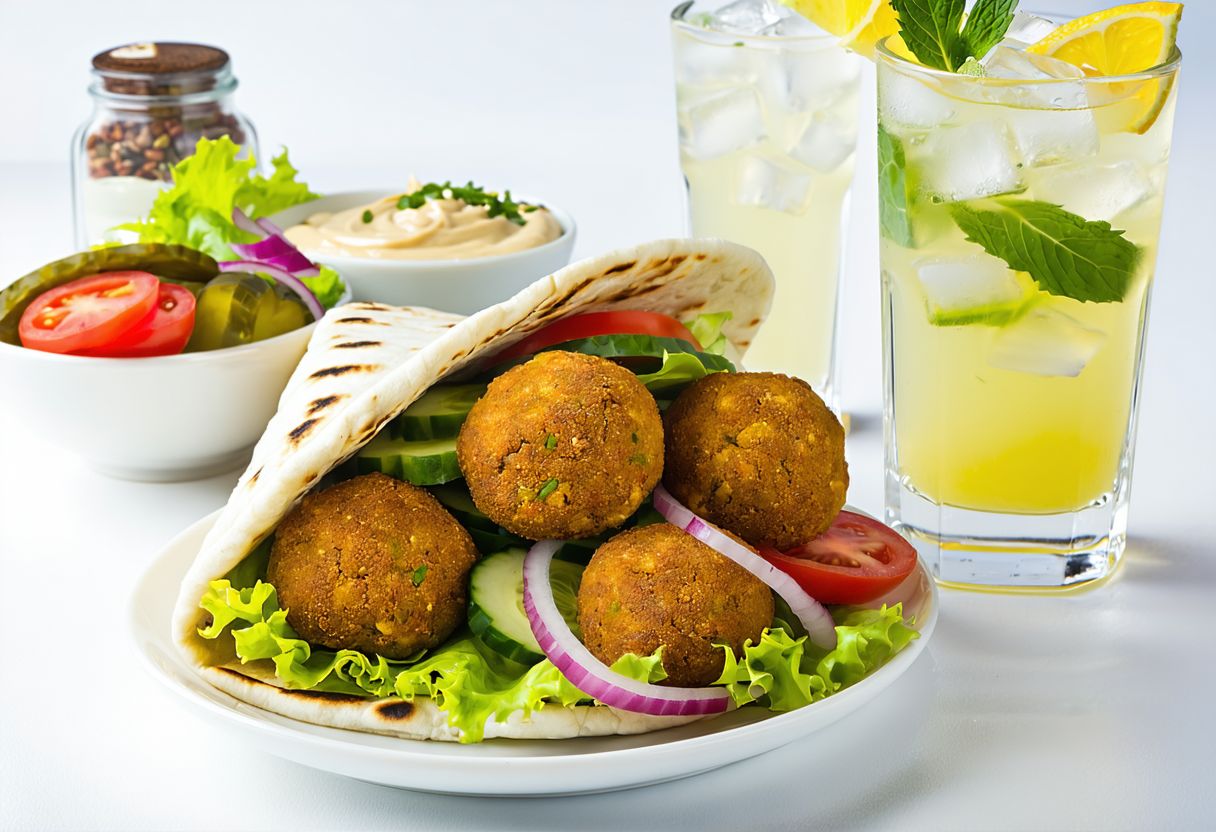Queijos mozarela, cebola frita, falafel, salada fresca e batatas fritas