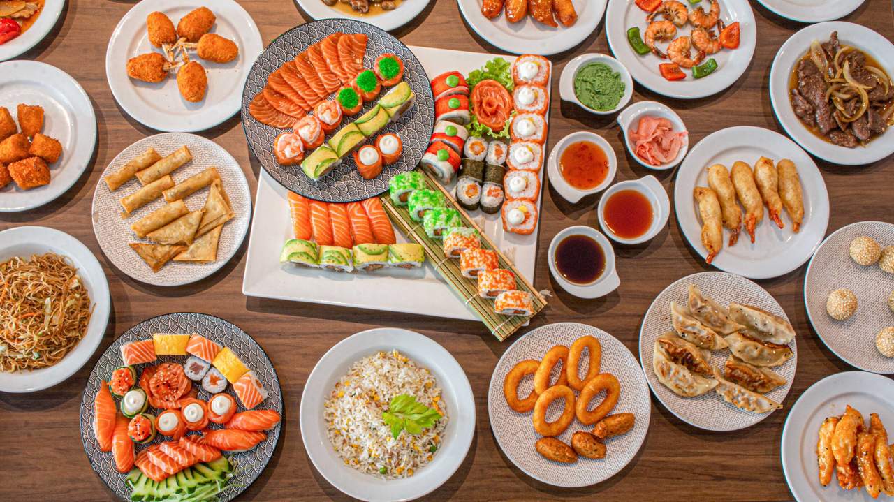8 uramaki mix c/ ovas, 7 uramaki california salmão, 7 maki salmão, 7 maki atum, 4 maki tofu c/ paté de salmão, 4 maki tofu c/ camarão, 2 nigiri camarão, 2 nigiri de salmão, 2 nigiri salmão c/ philadelphia e sésamo.