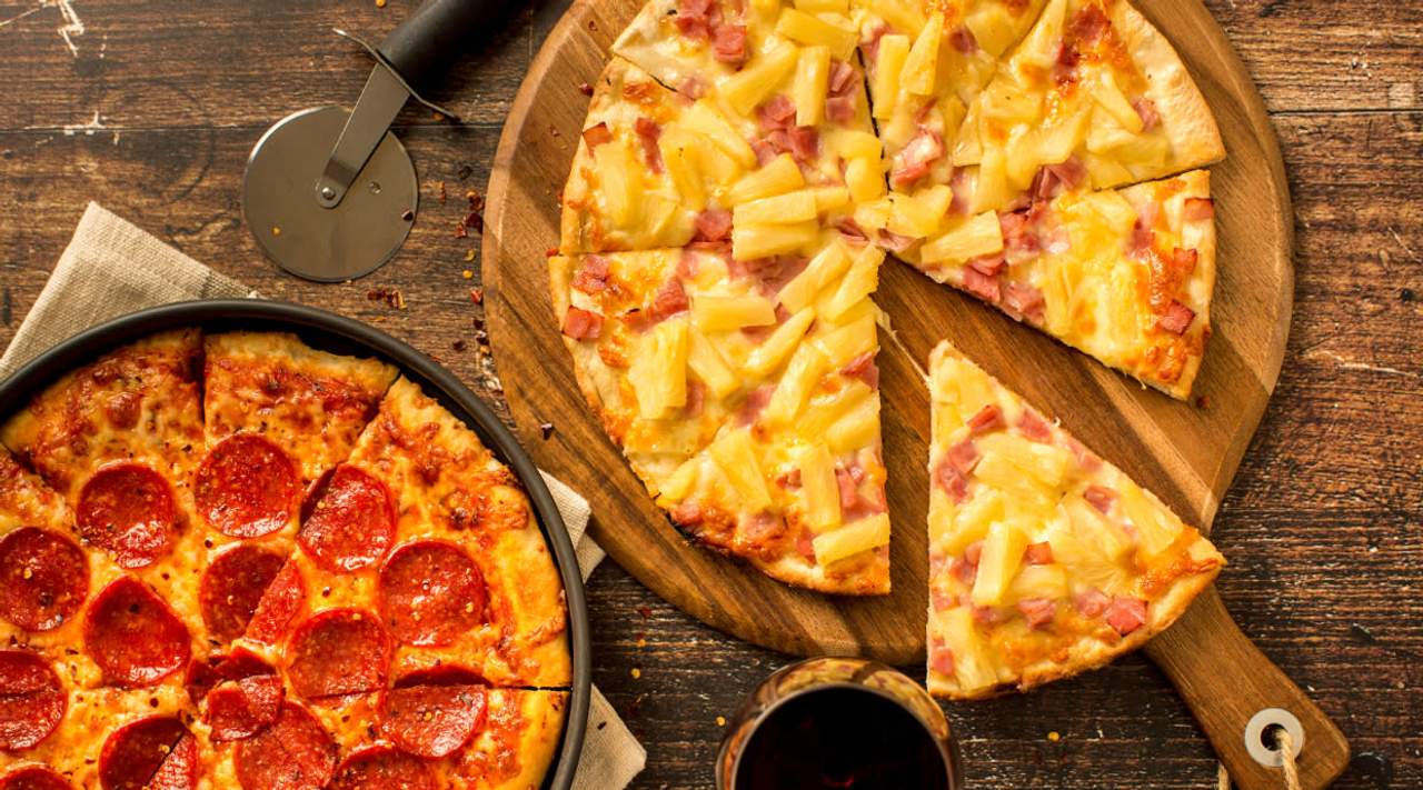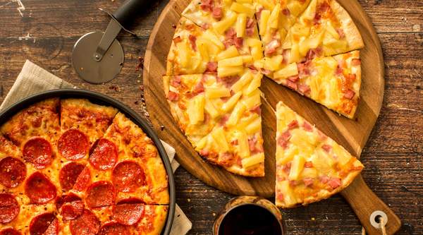 Tomate, mozarela, bacon, cogumelos frescos, ananás, pimento e orégãos.