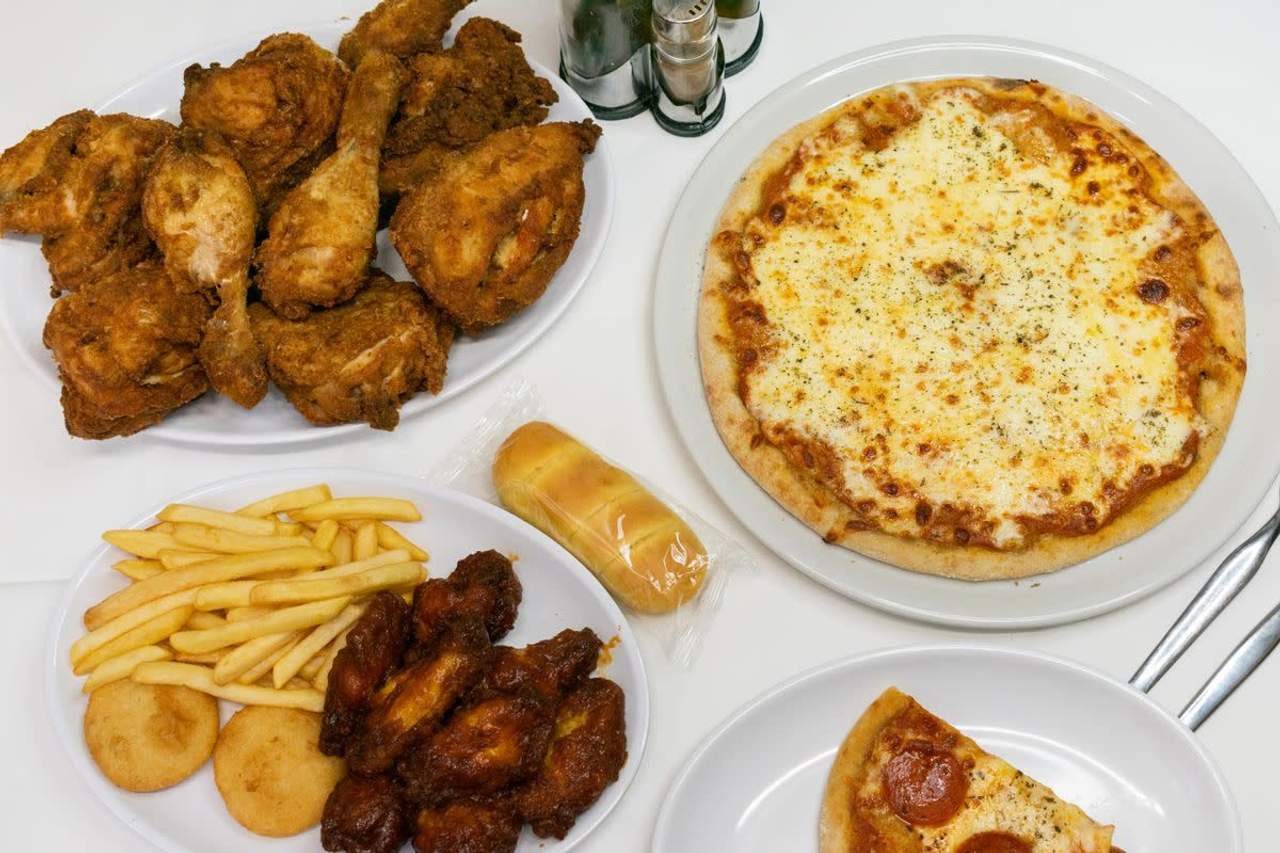 Milanesa de frango com molho de pizza e queijo muçarela gratinado. Acompanhado com batata frita 2 arepas frita e salada de repolho ralado.