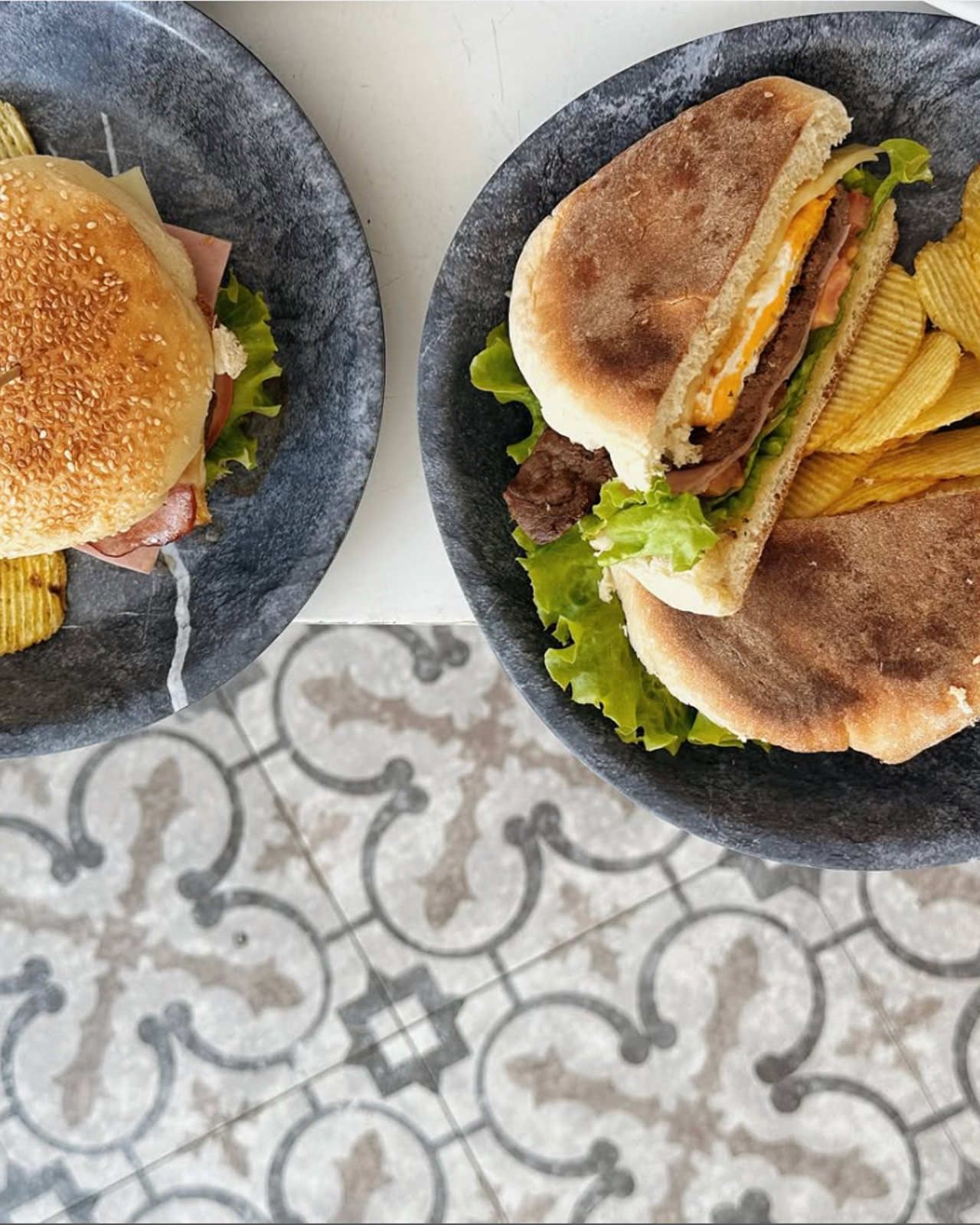 Bolo do caco, bife de vaca, tomate, alface, queijo, fiambre e ovo.