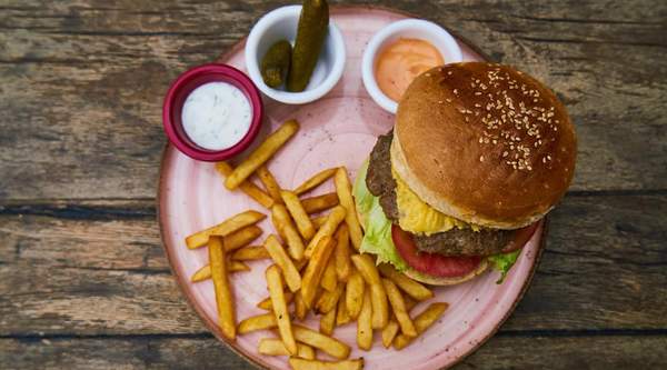 Hambúrguer de carne de vaca nacional(Beef meat), alface(Lettuce), tomate(Tomato), cebola(Onion) , queijo(Cheese), molho(Souce). Batata Frita e bebida incluída(French Fries andDrinks included).