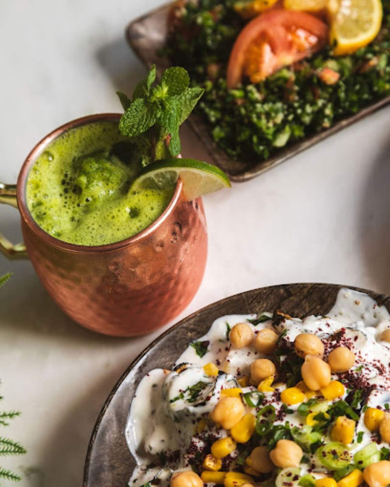 Fritters de grão-de-vico e ervas, enrolados em pão plano com iogurte com tahini, hortelã fresca, nabos em conserva e tomates; servidos com salada Fattoush e batata hara. Opção vegana disponivel a pedido.
