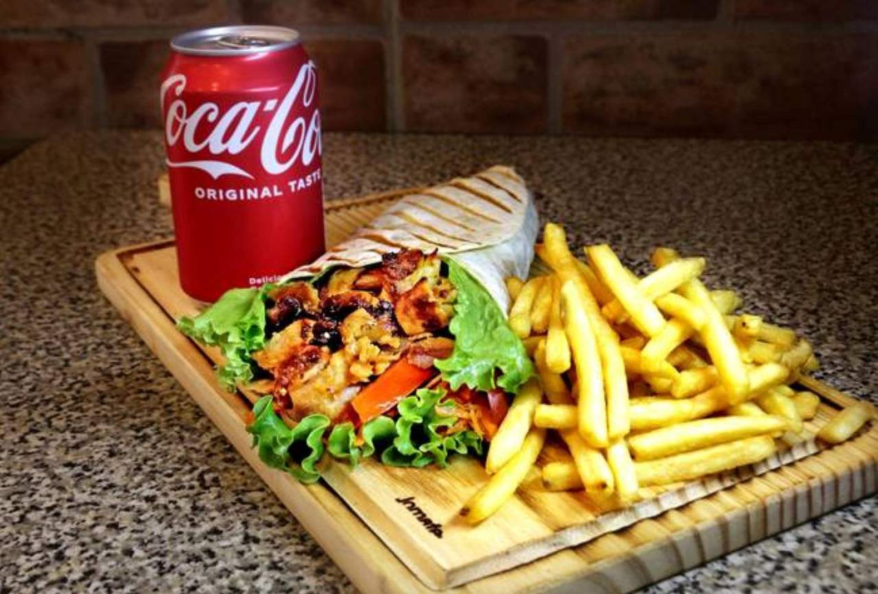 Escolha se deseja alterar para menu. Sandes enrolado saboroso recheado com carne grelhada, vegetais frescos e molho de especiarias.