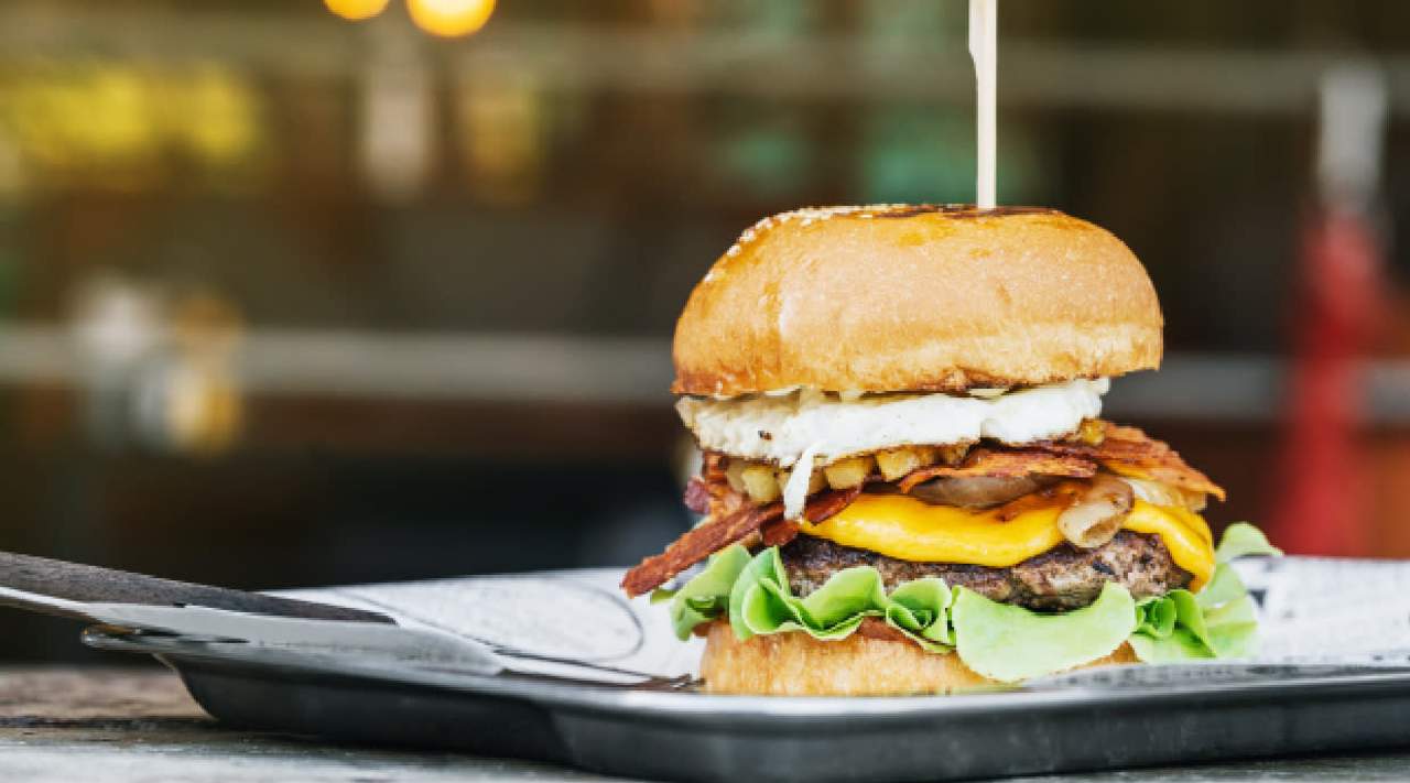 2 Hamburgueres 110g , novilho ou frango, queijo cheddar duplo, ovo estrelado, alface e tomate, servidos em pão artesanal com batatas fritas e mayonnaise aromatizada