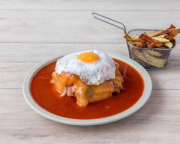 Bolo do caco madeira, bife de novilho ou frango, queijo, fiambre, linguiça, ovo estrelado e molho francesinha Acompanha com mix de batatas