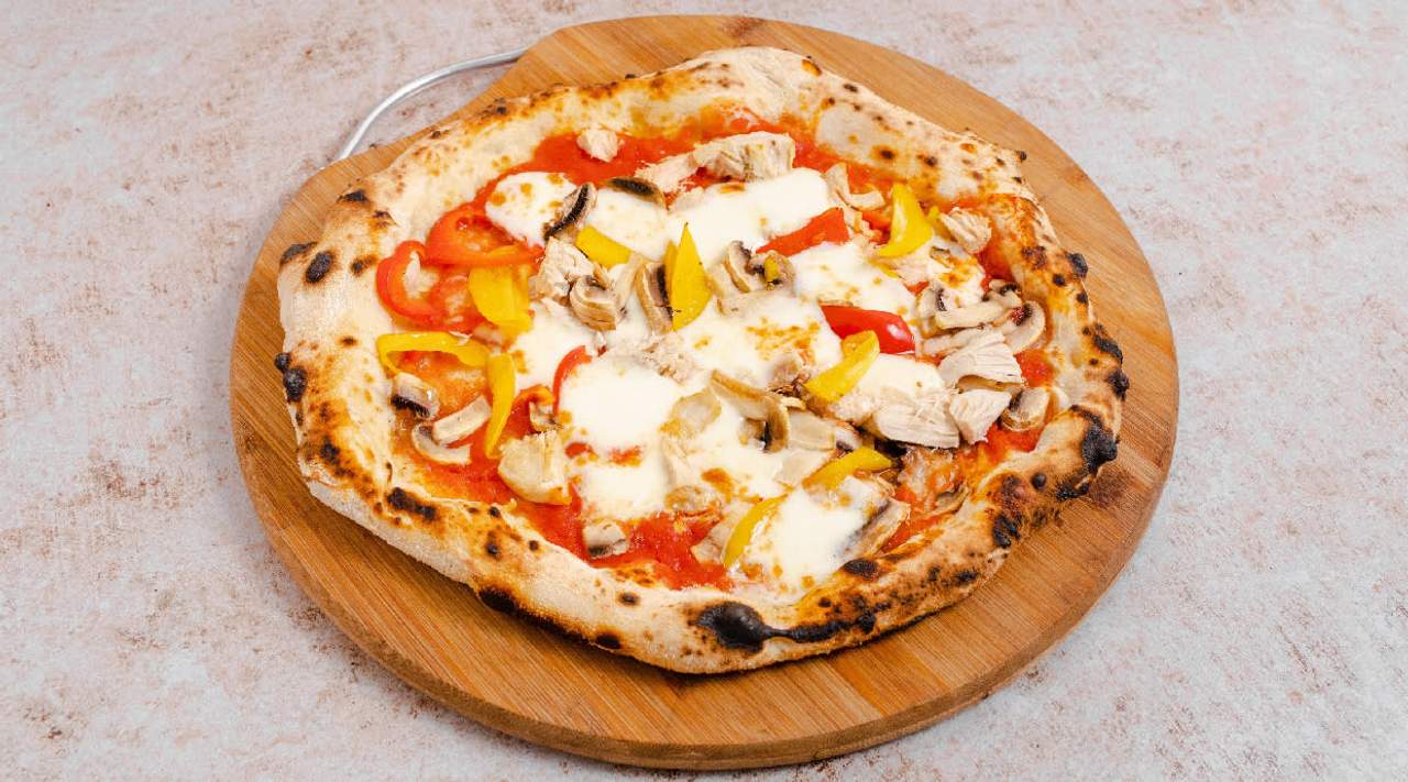 Molho de tomate s. marzano D.O. P, mozzarella, fiambre, cogumelos frescos, orégãos e um fio de azeite