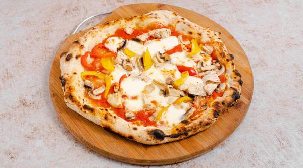 Molho de tomate s. marzano D.O.P, mozzarella, pepperoni, cogumelos frescos, cebola, azeite, creme balsâmico e orégãos
