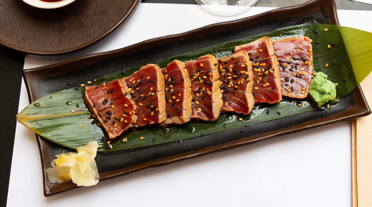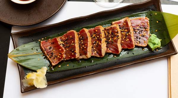 Lombo de atum grelhado com legumes glaciados, regado com um molho de soja e mel