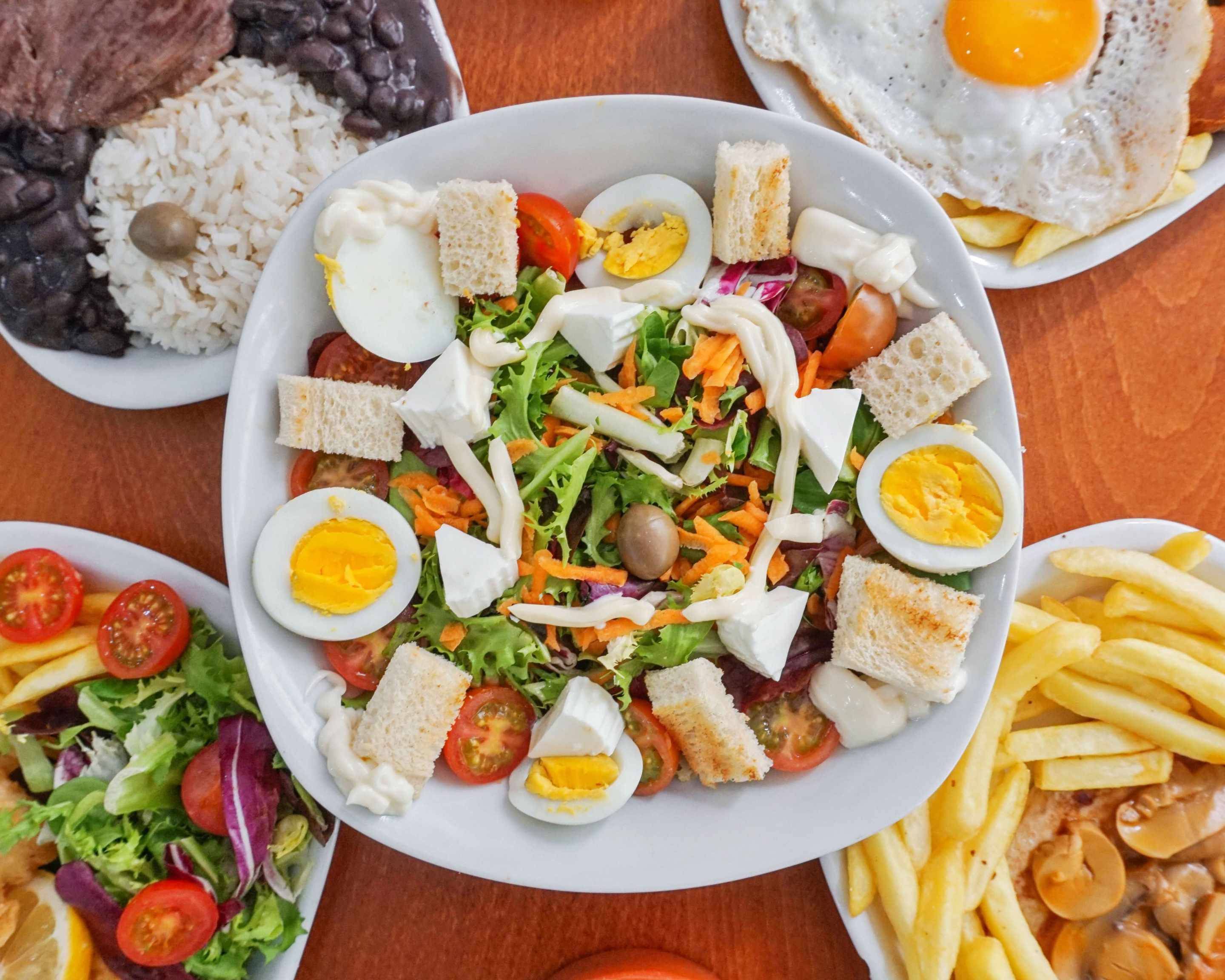 Atum, alface, tomate, cenoura, cebola, queijo fresco, ovo cozido.