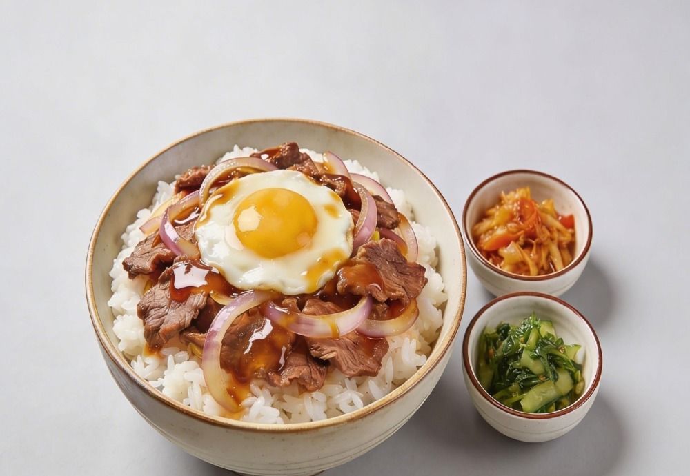 Arroz branco , Ovo , fatia de vitela ,Cebola branco e cebolinho Inclui faca e grafo