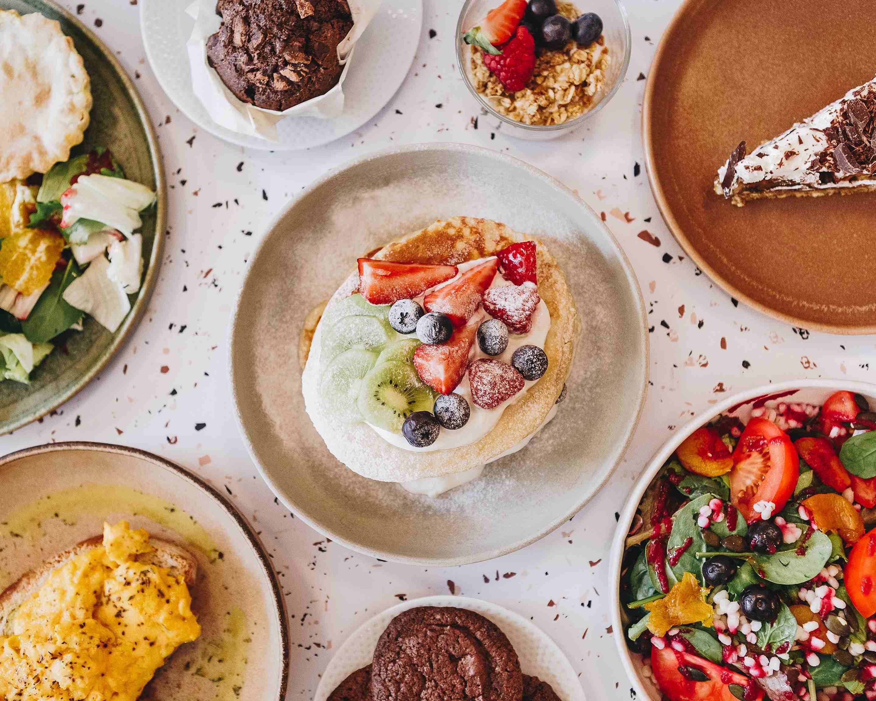 Panqueca com fruta fresca e iogurte cremoso