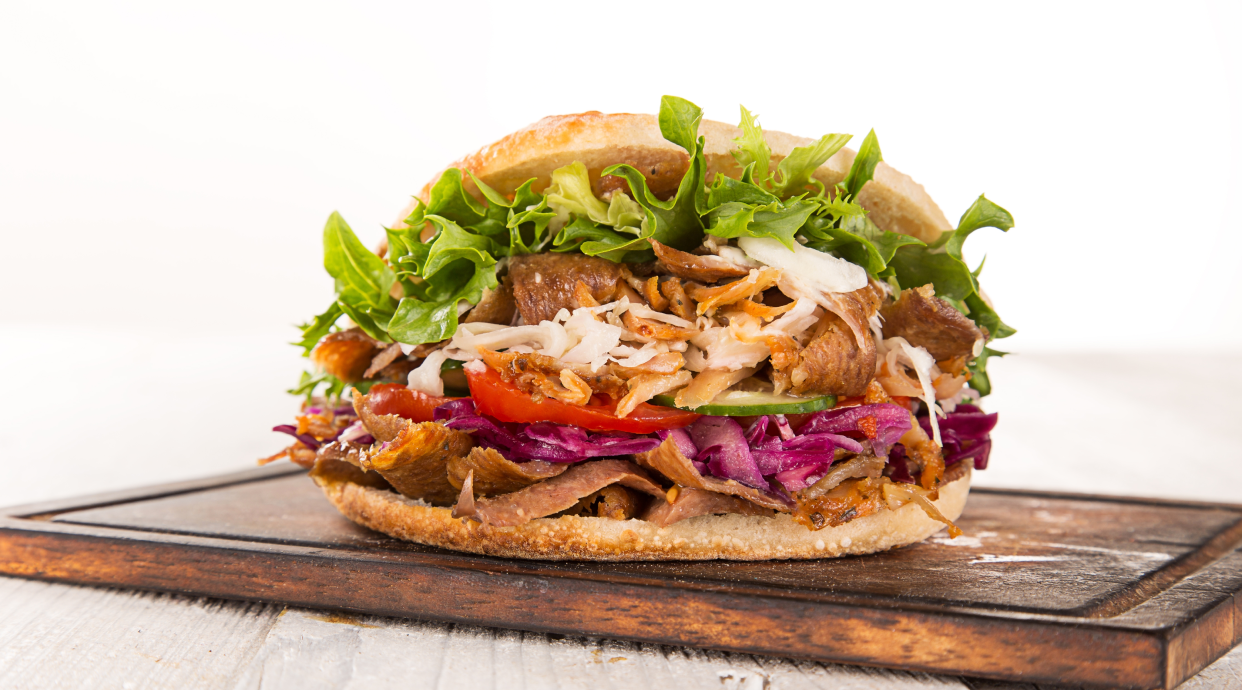 Carne de kebab suculenta, servida em pão turco, com saladas e molhos.