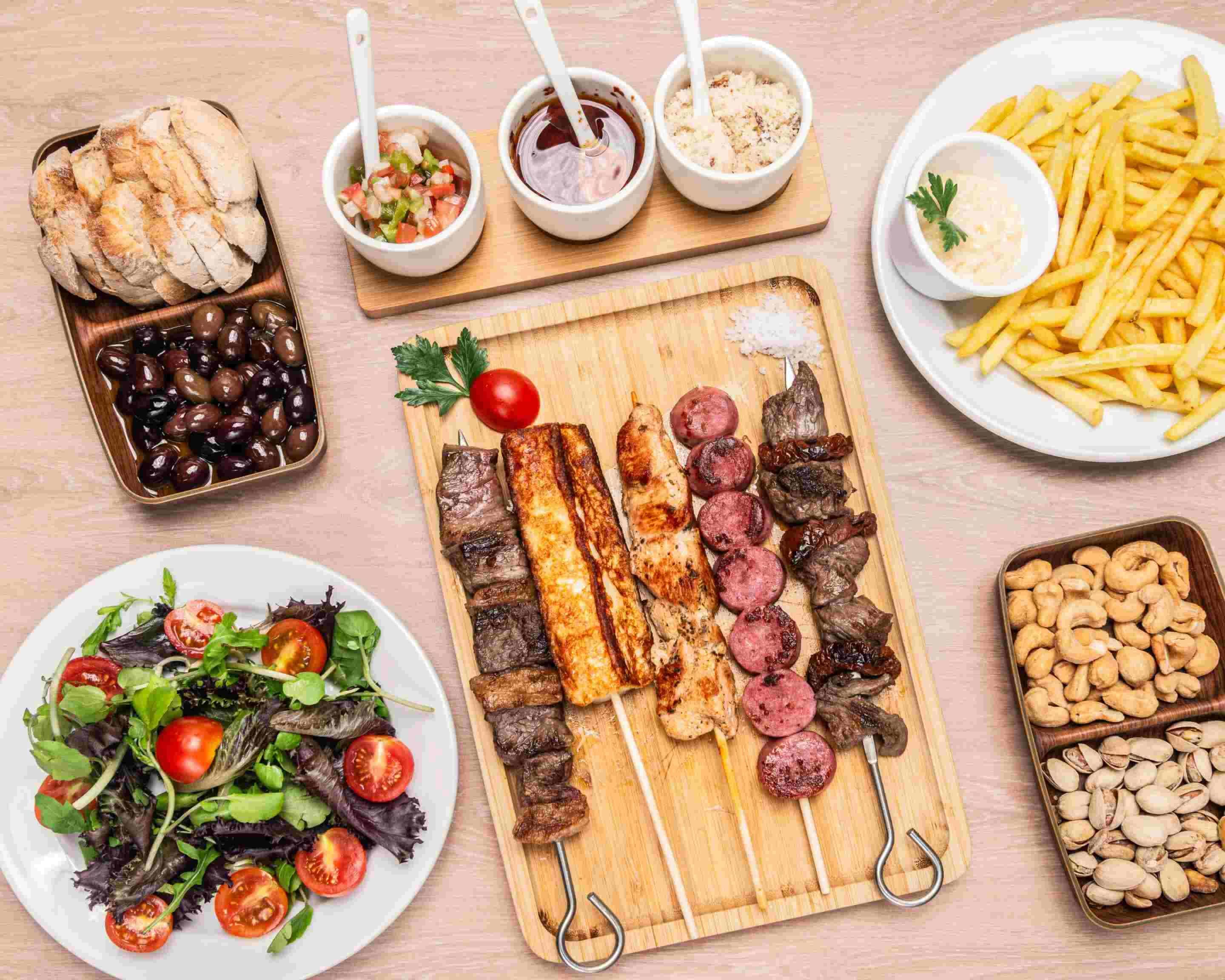 Dois espetinhos á escolha, alcatra,frango, coração de frango,queijo coalho,toscana,com arroz,batata,farofa e vinagrete.