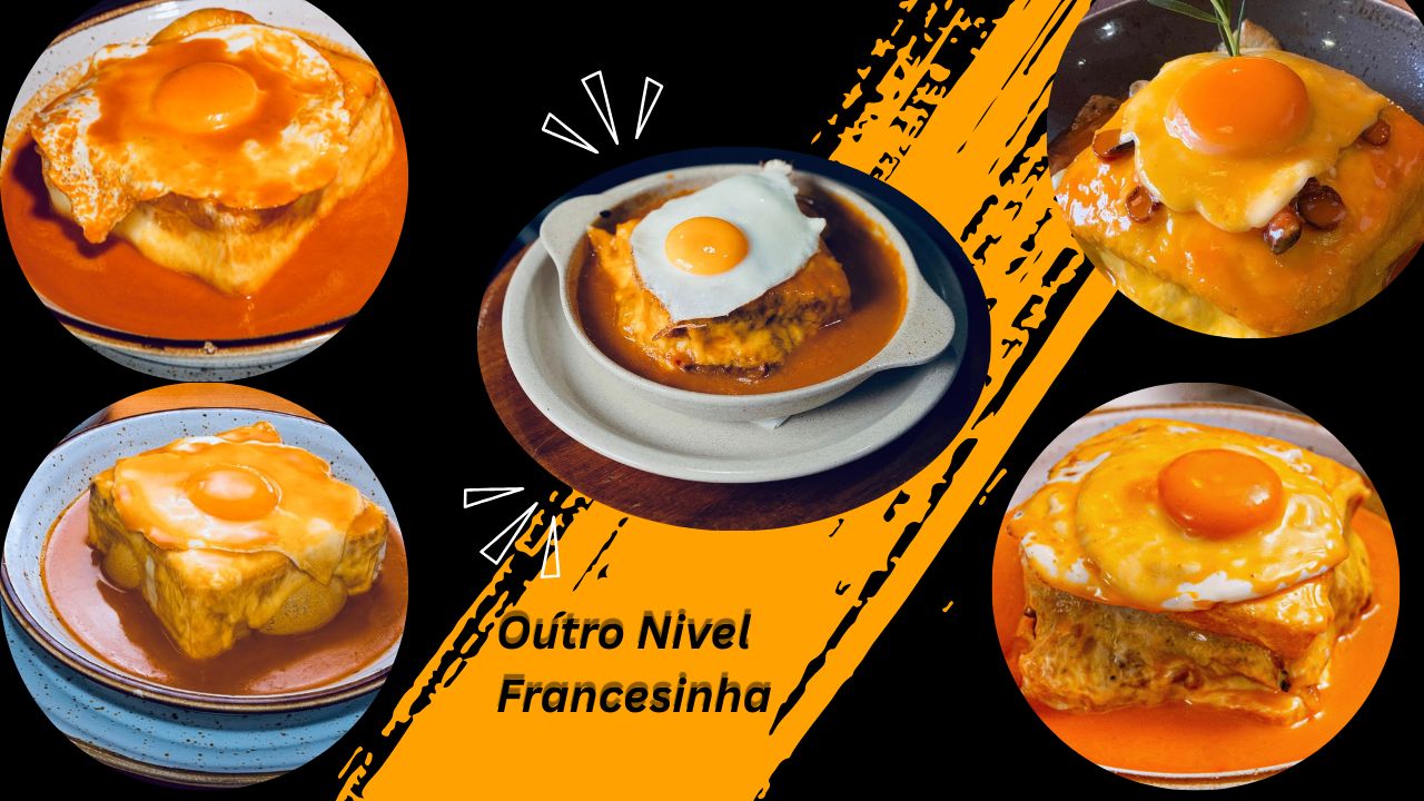 “A nossa Francesinha de outro nível — pão torrado recheado com fiambre, salsichas fumadas e peru, coberta com queijo derretido e o nosso molho secreto de tomate com cerveja. Finalizada com um fio de azeite e servida com batatas fritas douradas e ovo.”