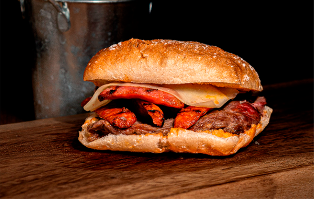 Bife de Novilho ou Frango, Pão Rústico, Pimentos Grelhados, Queijo Brie, Cebola Caramelizada, Rúcula e Maionese de Ervas