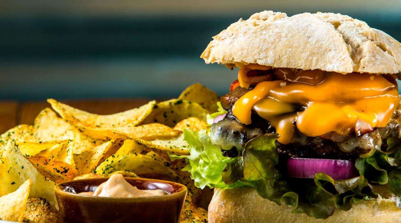 160g de Novilho, Cebola Caramelizado, Bacon Grelhado, Queijo da Serra Amenteigado, Rúcula, Tomate e Molho de Burga