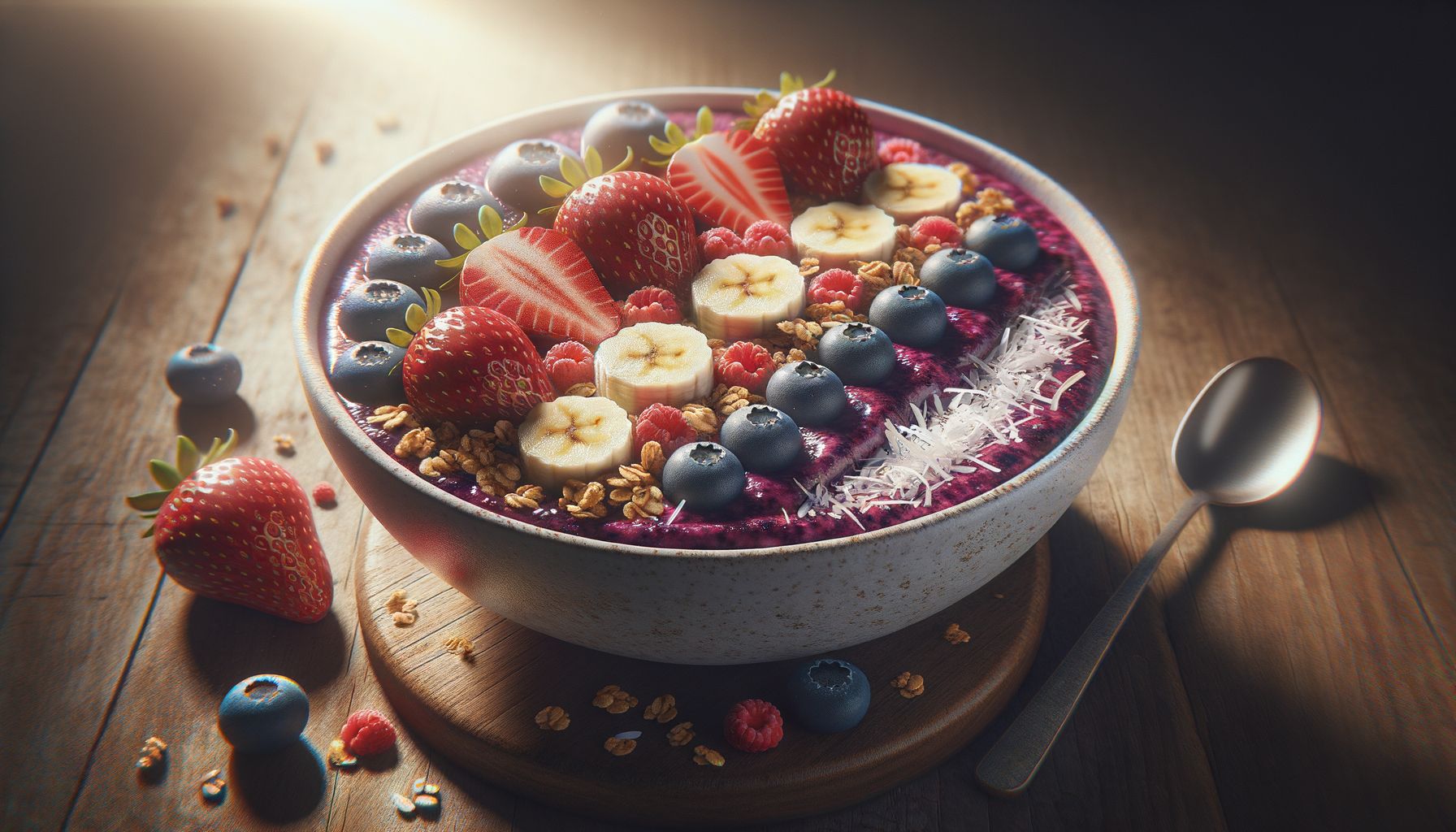 Açai na garrafa com a combinação tropical de cupuaçu e morangos frescos.