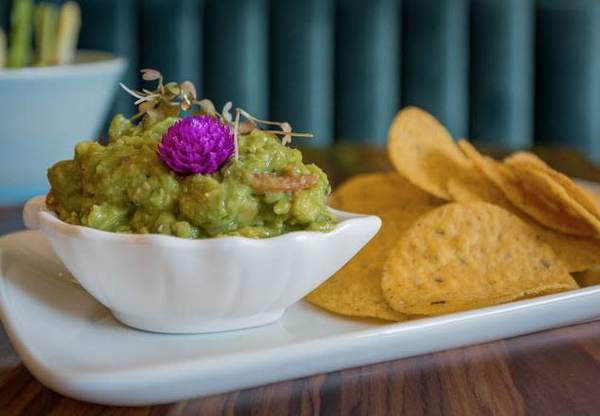 Cogumelos, creme de abacate, ovos escalfados, molho holandês e cebolinho, acompanhada com chips batata doce