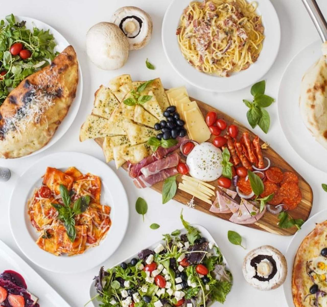 Molho pesto, mozarela, espinafres, queijo fresco, tomate cherry