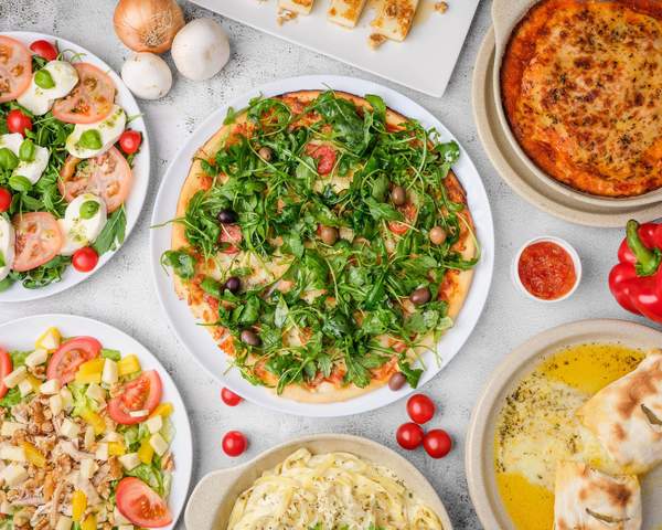 Tomate, tomate cherry, mozarella, rúcula, lascas de parmesão, azeitonas, alcaparras e orégãos