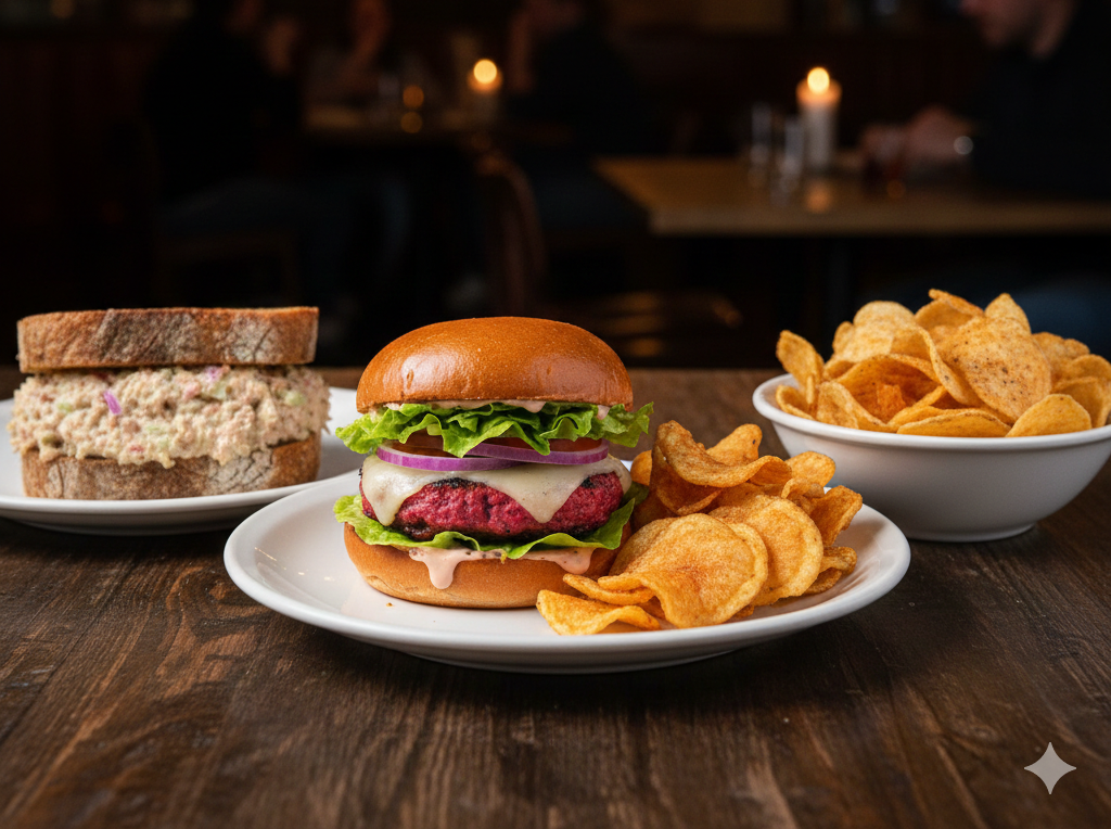 Smash vegetariano, pão rosa, molho branco de cogumelos frescos ACOMPANHA C/BATATA FRITA