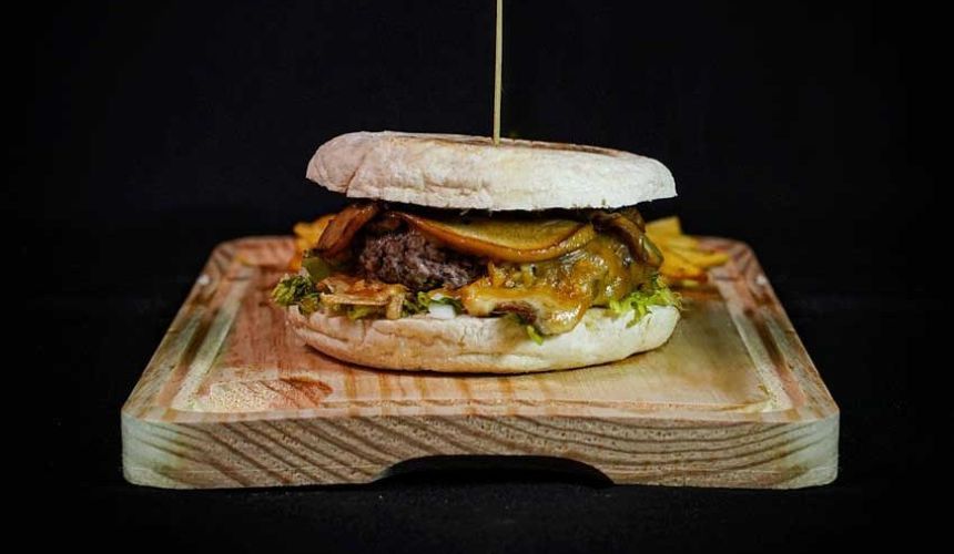 Com batata frita. Hambúrguer com ingredientes verdes frescos