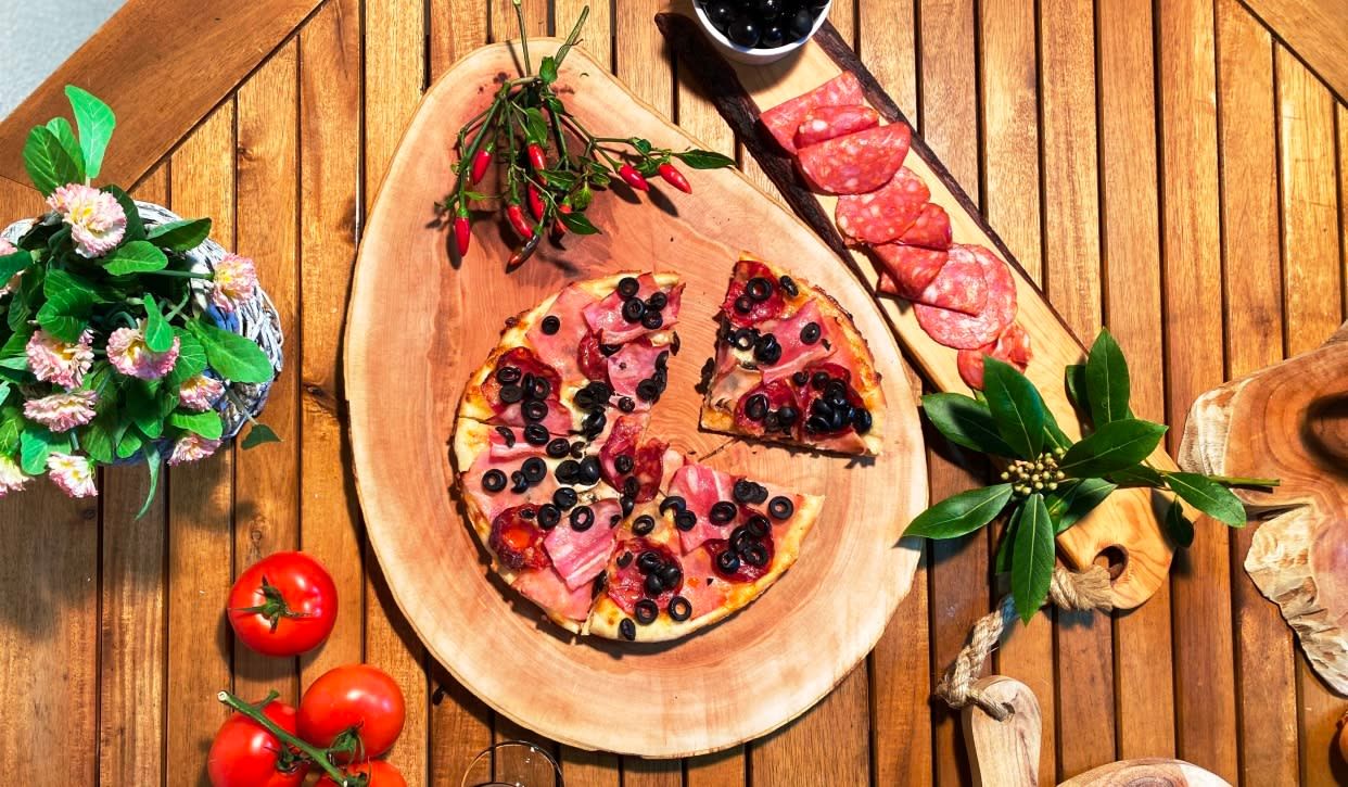 Mozzarella, tomate, fiambre, chouriço, bacon, cogumelos e azeitonas.