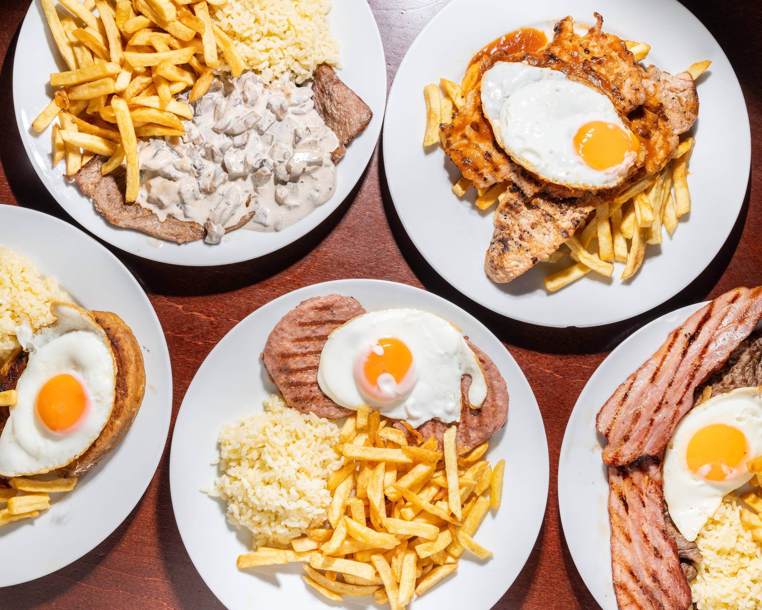 Bife, batata frita, ovo, salada e arroz.