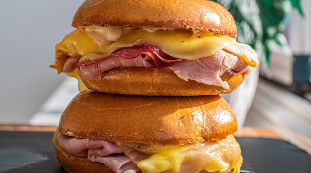 Pão integral, presunto, queijo, alface, tomate e molho pesto