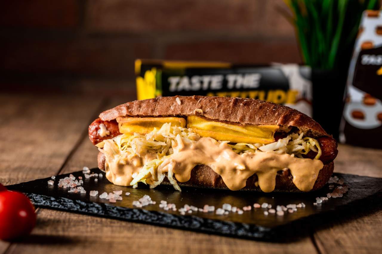 Chiflă coaptă proaspăt, puten Kasekrainer (de curcan), sos tartar, sos Burger, ceapă caramelizată, varză albă murată, jalapeno, salată coleslaw - 400g
