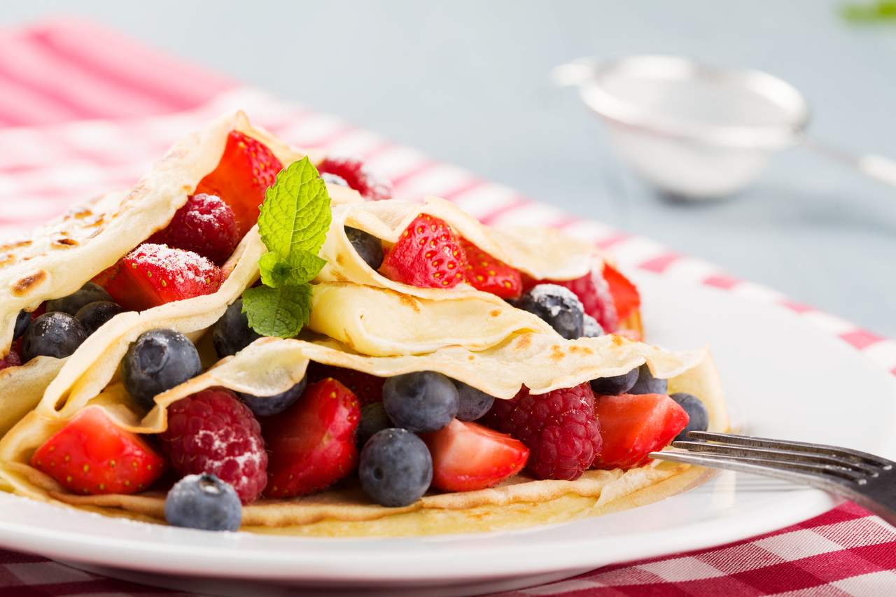 Clatita pufoasa americana, nutella, fructe proaspete banane, căpșuni, afine și zmeură, toping de nutella