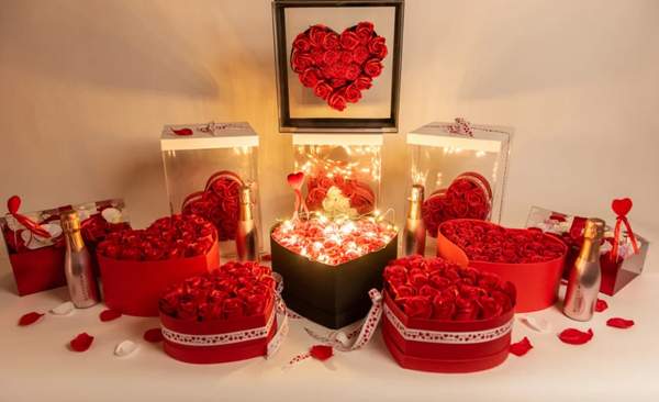 CUTIE IINIMA SATINATA MEDIE CU 28 TRANDAFIRI SAPUN ROSII