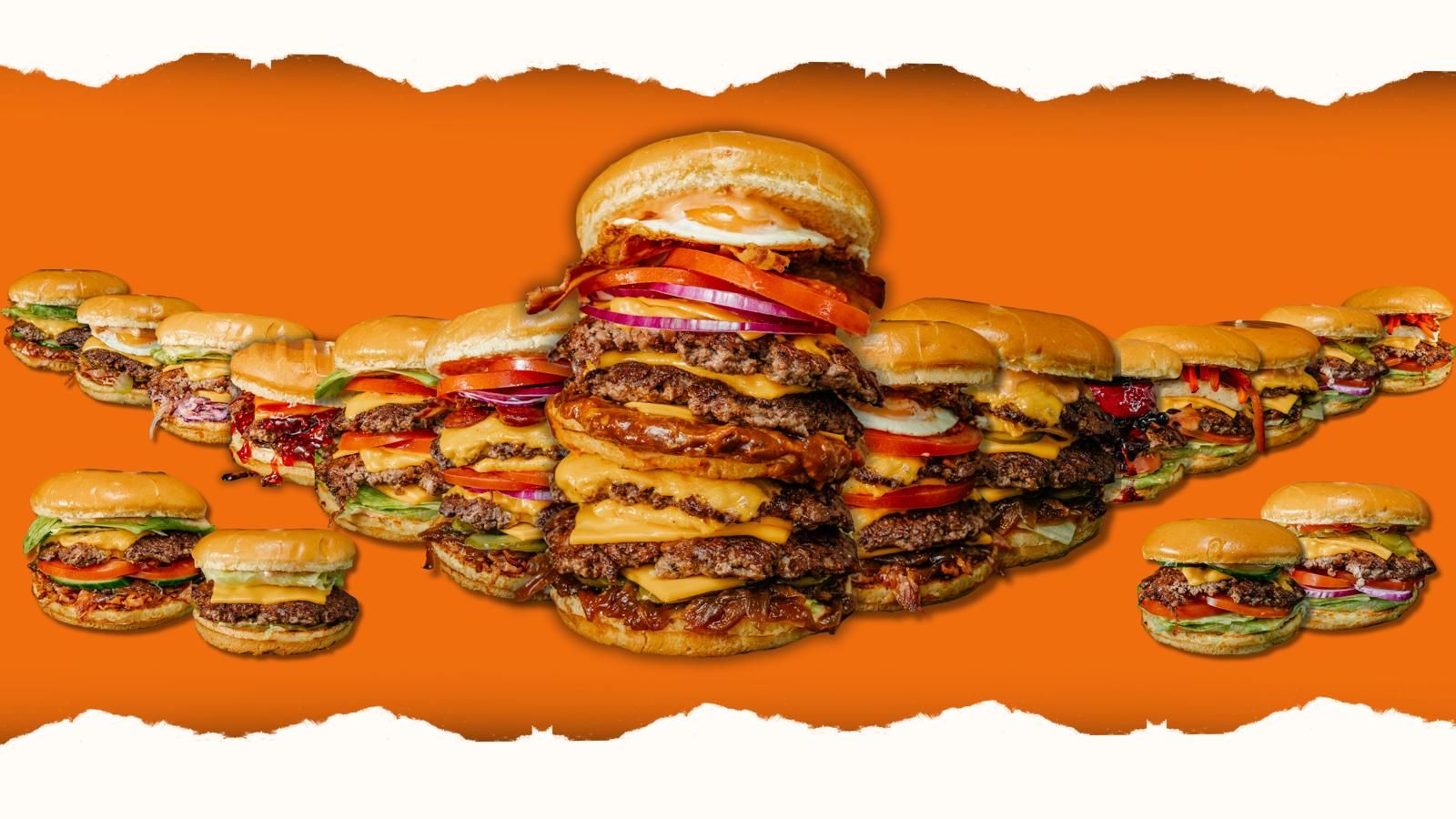 3x brioșă, 4x carne de vită/pui, 6x cașcaval, salată, ceapă caramelizată, castraveți murați, ceapă roșie, roșii, ou, 2x slănină, sos țigănesc, sos de burger + cartofi prăjiți si băutură la alegere - 1.1kg