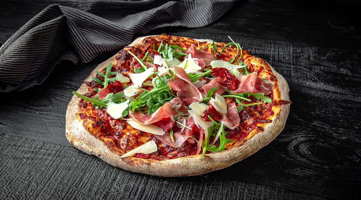 Aluat pizza 300g, mozzarella 200g, prosciutto crudo 75g, roșii cherry 60g, sos de roșii 50g, parmezan 30g, rucola 30g