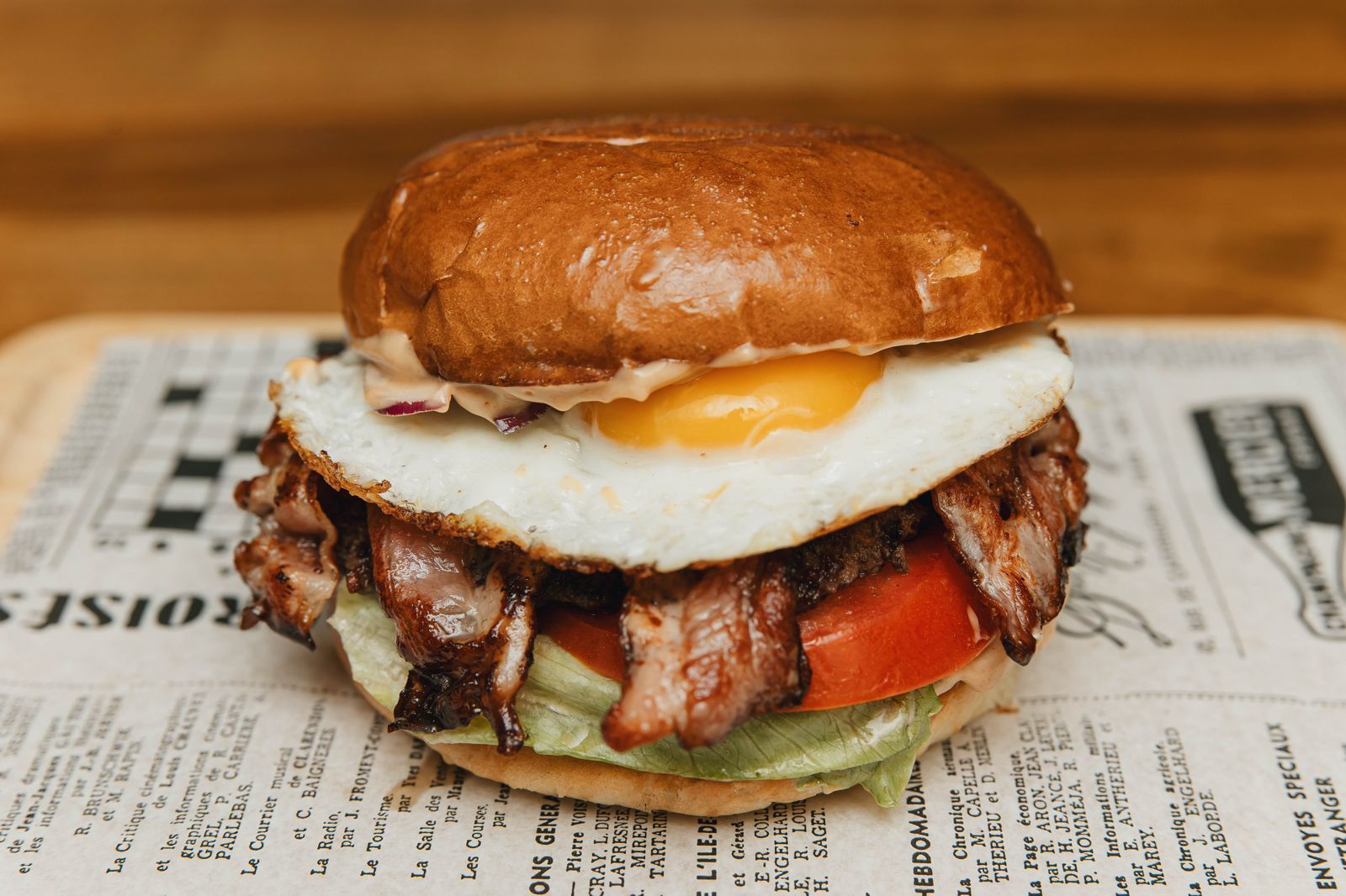 Chifla briosa, bacon, crema de branza, ou, salata, ceapa rosie, cedar, rosie