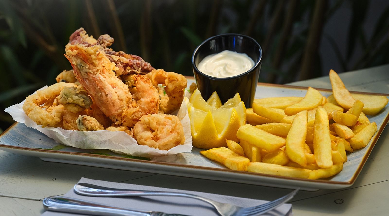 Piept de pui în crustă de fulgi de porumb, cartofi prăjiți, sos cocktail á la Chef - 550g