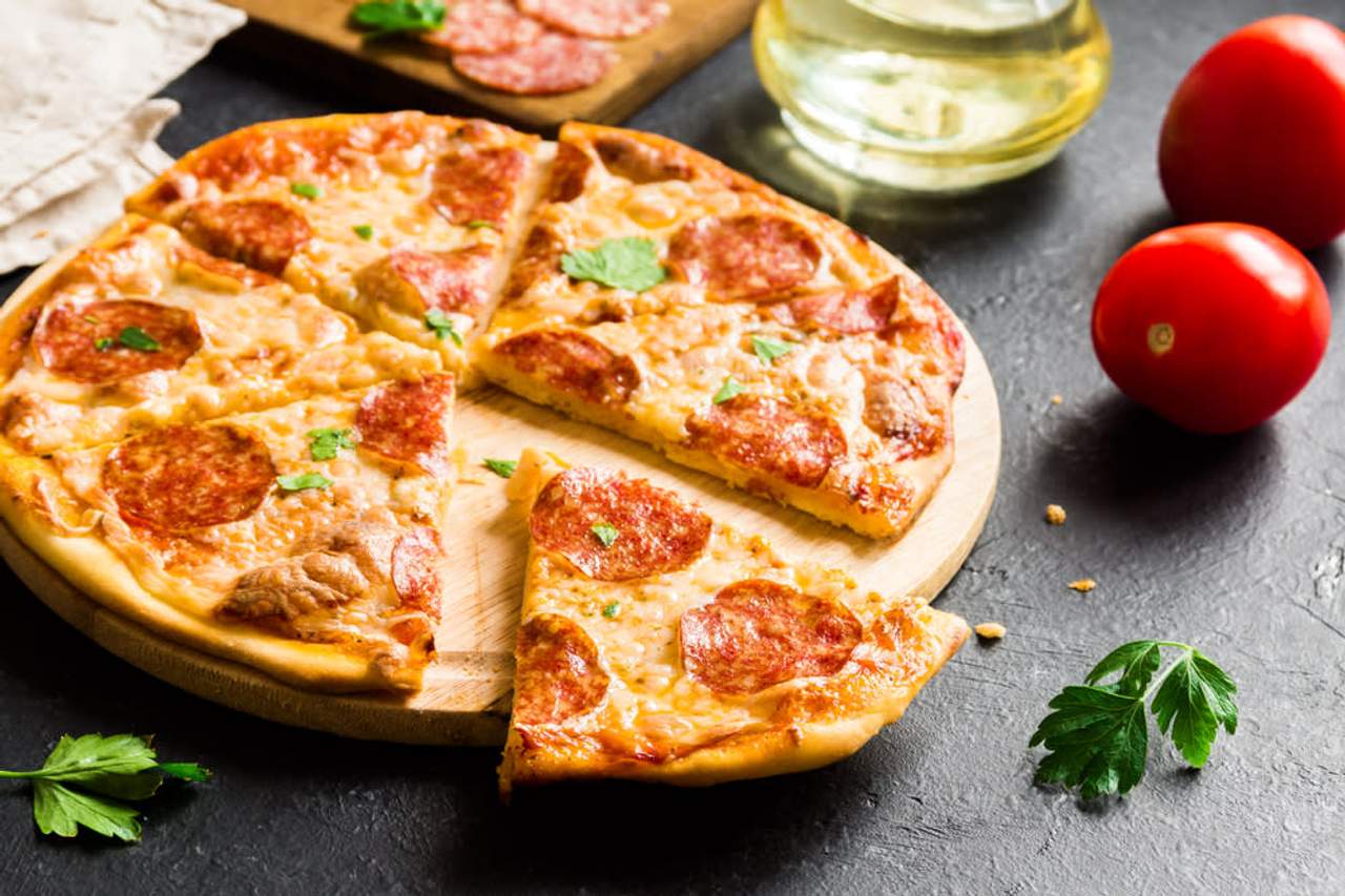 Aluat, sos de rosii, mozzarella, salam pizza, sunca presata, bacon, masline, ciuperci, ardei gras - 2kg