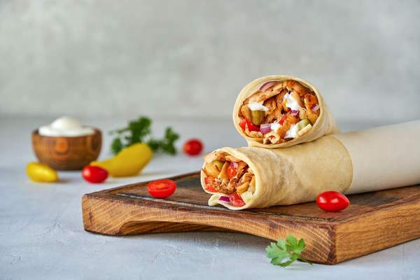 Lipie tortillia 70 gr., carne vita-pui 150 gr., cartofi 120 gr., mozzarella 50 gr., sos usturoi.40 gr., mujdei. 20 gr., sos samurai usor picant 40 gr., sos cheddar gr., castraveti murati 70gr.