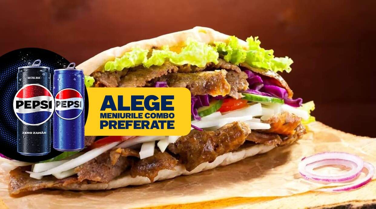 carne 110g,cartofi prajiti 70g,3 sosuri la alegere, 3 salate la alegere,lipie-400g Ingrediente: -Carne de vita berbecut 110g(carne vita berbecut, apa, proteina din soia, condimente in proportie variabila (piper, chilly, chimion, curry (contine MUSTAR), boia, cimbru), legume deshidratate ( usturoi, ceapa), sare, di si tri fosfati de sodiu, acetat de sodiu, citrat de sodiu, acid ascordic, ascorbat de sodiu, celuloza pulbere, glutamat monosodic)-Cartofi prajiti (congelati) 120g (cartofi (96,1%), ulei de palmier (3,9%))-Lipie 50 g (apa, zahar,drojdie, sare alimentara iodata) Valori nutritionale (exprimate la 100g): KJ: 872.4, Kcal: 208.7, Grasimi: 8.9, Acizi grasi saturati: 0.6, Glucide: 30.3, Zaharuri: 0.6, Proteine: 2.1, Sare: 0.9 Alergeni: Cereale care contin gluten (grau, secara, orz, ovaz, grau spelt, grau mare sau hibrizi ai acestora) si produse derivate, Mustar si produse derivate