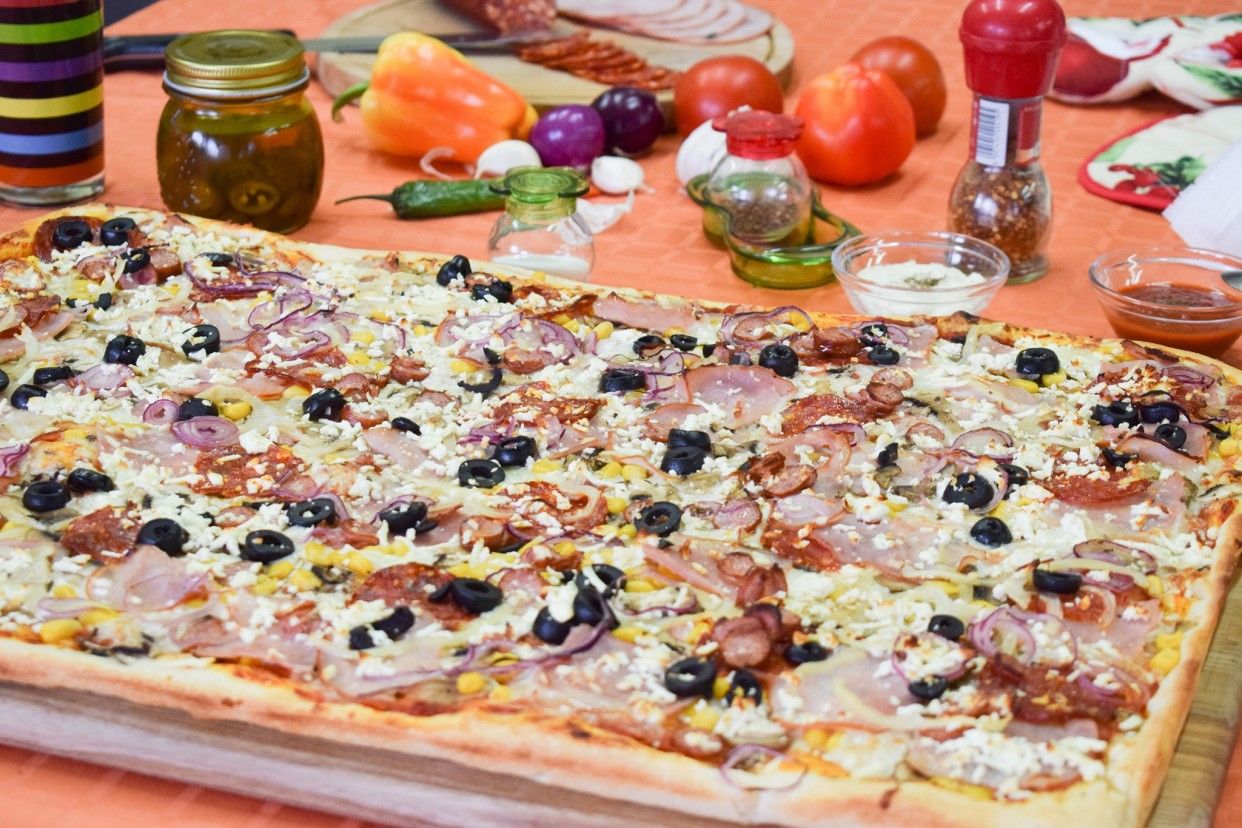 sos de rosii, salam Chorizo, salam uscat, salam de vara, porumb, masline feliate, topping pizza first/mozzarella